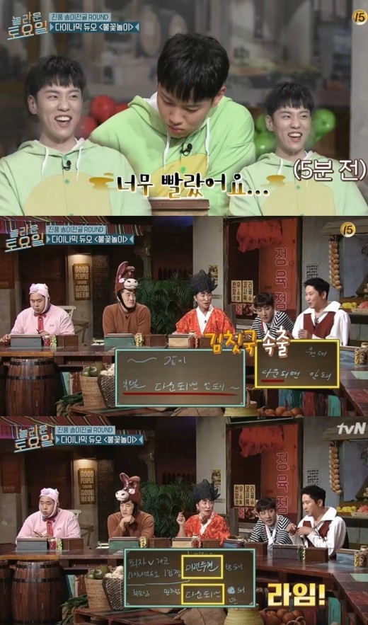 3일 방송된 tvN '놀라운 토요일'에는 개그맨 장동민과 가수 박재정이 게스트로 출연했다. 이날 송이버섯 전골을 걸고 펼쳐진 두 번째 문제에는 다이나믹듀오의 '불꽃놀이'가 출제됐다.