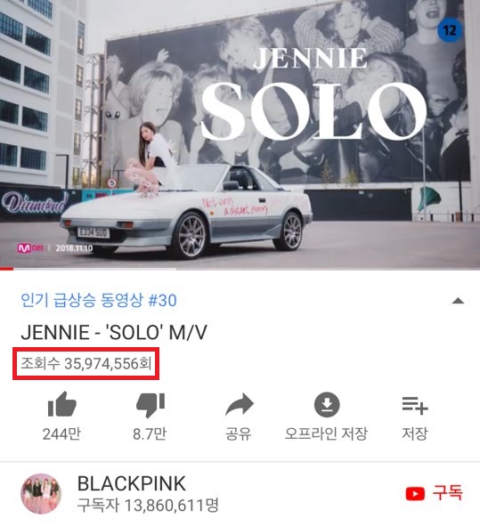 'SOLO' 뮤직비디오는 공개 15시간 만에 1000만뷰를 돌파하며 한국 솔로 아티스트 사상 최단 기록을 세웠다. 어제 오후 9시쯤에는 3000만뷰를 돌파하며 독보적인 상승세를 이어가고 있다. 오늘 오전 9시 기준으로는 3500만뷰를 넘어서며 가파른 속도가 멈추지 않고 있다.