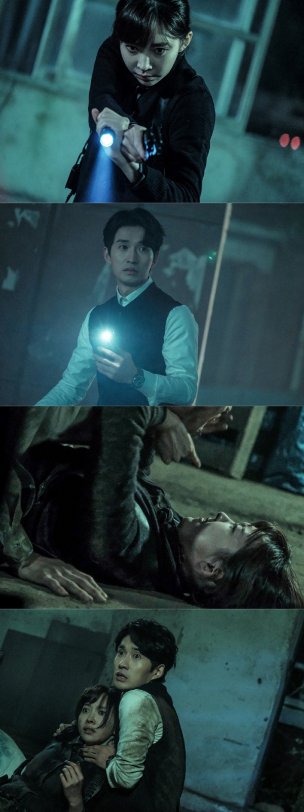 공개된 사진 속 한진우, 강경희의 숨 막히는 수사 현장이 시선을 사로잡는다. 짙은 어둠을 뚫고 총구를 겨눈 채 수색을 펼치는 강경희는 날카로운 카리스마를 발산한다. 한진우 역시 날 선 눈빛으로 조심스레 현장을 살핀다. 또 다른 사진 속 예상치 못한 괴한의 습격에 사투를 벌이는 강경희의 모습에 긴장감이 폭발한다. 한진우와 강경희가 무언가를 발견하고 두려움에 떨고 있어 위기감도 고조된다.