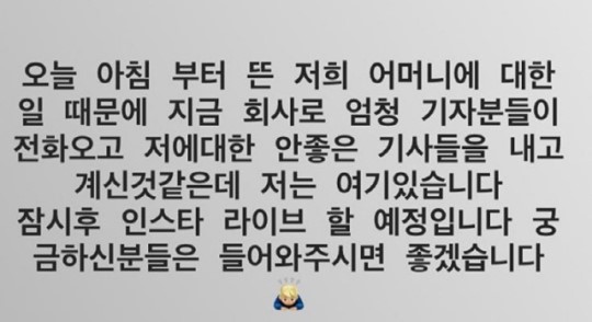 도끼는 26일 자신의 인스타그램에 "오늘 아침부터 뜬 저희 어머니에 대한 일 때문에 지금 회사로 전화가 오고, 안 좋은 기사들을 내고 계신 것 같다"며 "저는 여기 있다. 잠시 후 인스타 라이브 할 예정이니 궁금하신 분들은 들어와주시면 좋겠다"는 글을 남겼다.