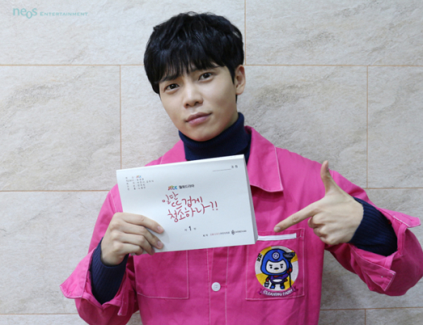 사진 속 김민규는 '일뜨청' 대본과 함께 포즈를 취하고 있다. 핑크색 유니폼을 입고 청소 요정으로 완벽 변신한 모습이다.