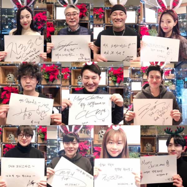 공개된 사진에는 가족이엔티의 배우 손병호를 비롯해 손진환, 최대성, 재희, 육진수, 전우재, 정다혜, 진소연, 방주환, 이세희, 안종민 등이 귀여운 머리띠를 착용하고 싸인과 함께 크리스마스 인사를 전했다.