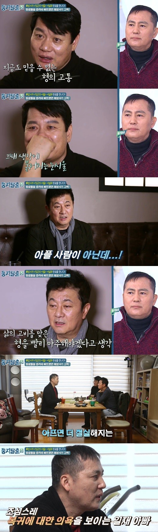 정흥채는 "그게 형 성격이다. 맥주집을 오픈했을 때 1년 정도를 못갔다. 그랬더니 '나 암 걸린 거 몰랐니'라고 하더라. 알고 전화한 줄 알았나보더라. 4기라고 해서 깜짝 놀랐다. 형이 술, 담배도 안하는데 도대체 어떻게 된지 놀랐는데 '운명인가보더라'라고 해서 속이 아렸어"라며 뭉클함을 드러냈다.