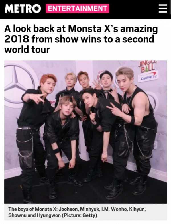 영국 유명 신문 '메트로'는 26일과 27일(현지 시각) 공식 사이트와 공식 SNS를 통해 "음악방송 1위에서 두 번째 월드 투어에 이르기까지 몬스타엑스의 놀라운 2018년을 돌아본다"라는 타이틀의 기획 기사를 통해 전세계를 무대로 눈부신 글로벌 활약을 펼치고 있는 몬스타엑스를 집중적으로 보도했다.