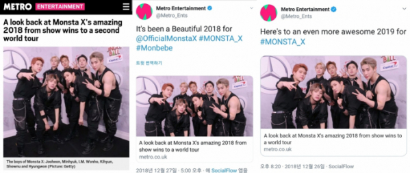 이와 함께 몬스타엑스는 영국 유명 일간지 '메트로'에도 소개되며 세계에서 주목받는 그룹의 성장세를 또다시 증명하게 됐다.