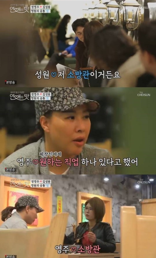 이어 정영주에게 책 선물을 받은 김성원은 "제가 무슨 일 하는지 아시냐. 소방관이다"라고 해 정영주를 깜짝 놀라게 만들었다. 앞서 정영주는 소개팅을 앞두고 "원하는 직업이 하나 있다. 소방관이다"라고 언급한 바 있다.