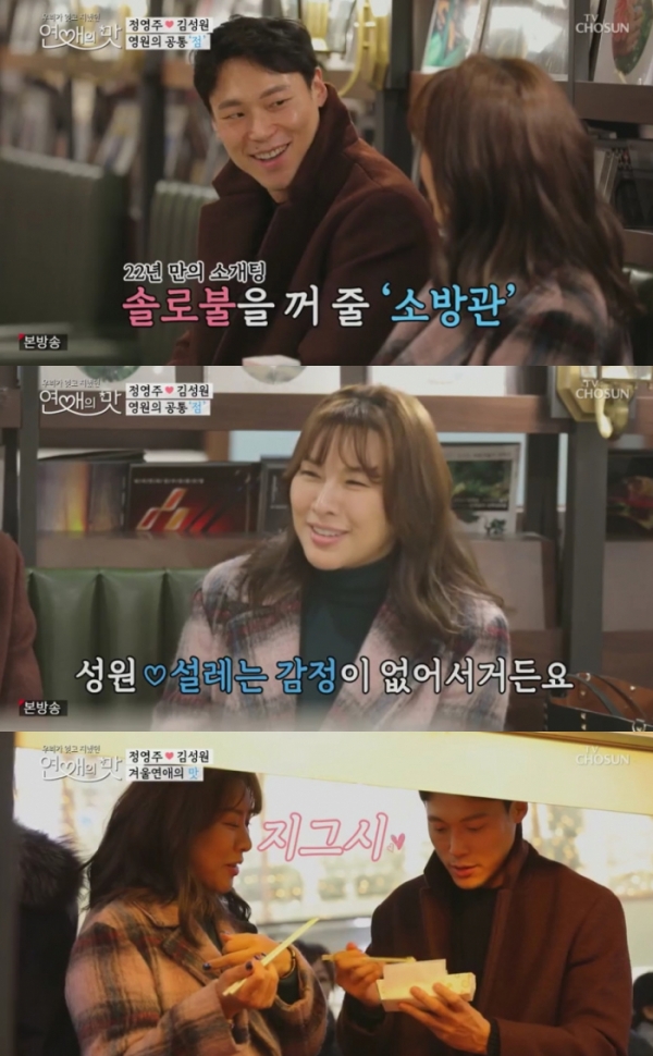 '연애의 맛' 뮤지컬배우 정영주와 소방관 김성원의 소개팅이 공개됐다.