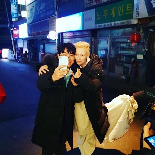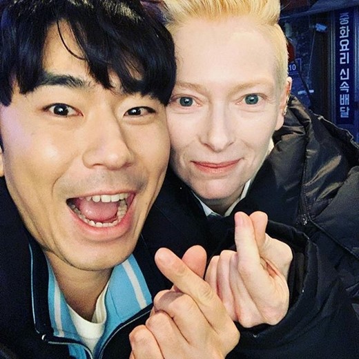 공개된 사진에서 이시언과 틸다 스윈튼이 손가락 하트를 보내고 있다. 이시언은 틸다 스윈튼 옆에서 장난기 가득한 표정을 짓고 있다.