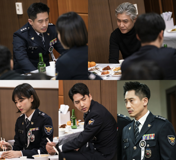 공개된 사진에는 장례식장에 모여 함께 동료를 잃은 슬픔을 나누고 있는 우태석과 채동윤(차선우 분), 양기원(이문기 분), 반지득(배유람 분)과 신가영(배다빈 분) S&S팀과 이들과 한 장소에서 포착된 전춘만의 모습이 담겨있다. 경찰 제복을 완벽히 갖춰 입고 남다른 포스를 뿜어내고 있는 우태석과 S&S팀은 침통한 분위기 속에서 함께 위로를 나누고 있어 여전히 흔들림 없는 의리가 느껴지는 것은 물론, 보는 이들마저 든든한 마음이 들게 해 눈길을 끈다. 반면 S&S팀과는 다른 테이블에 앉아있는 전춘만은 특유의 여유가 느껴지는 표정과 함께 야비함과 야욕이 엿보이는 눈빛을 발산하고 있어 긴장감을 자아낸다.