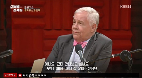 세계적 투자 전문가 짐 로저스가 23일 KBS1 '오늘밤 김제동'에 출연해 한국 청년들에게 "자신이 좋아하는 것을 하라"고 조언했다.