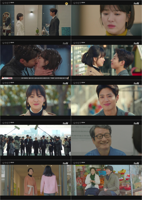 이날 진혁(박보검 분)은 수현(송혜교 분)의 이별 통보를 받아들이지 않았다. 그는 자신의 어머니는 물론 수현이 이해하고 받아들일 때까지 기다리겠다고 다짐했다. 수현은 진혁이 건넨 사진을 받아들고, 그 사진 속에서 미소짓는 자신을 발견했다. 가장 행복한 순간이었다고 깨달았던 수현은 진혁을 찾아갔고, 뜨거운 키스로 해피엔딩을 맞았다. 시청자들은 '남자친구'를 통해서 가슴 절절한 사랑을 다시 한번 깨닫게 됐고, 깊은 여운을 간직하게 됐다.