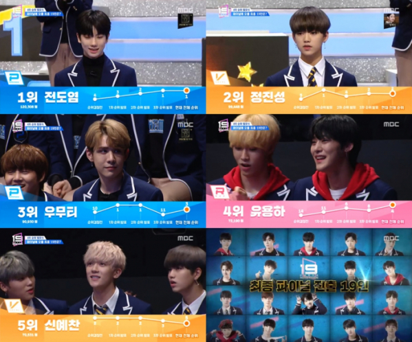 마지막으로 10위 박성원, 11위 김준서, 12위 이상민, 13위 수런, 14위 김영원, 15위 이예찬, 16위 송병희, 17위 박시영, 18위 이종원, 19위 배현준이 파이널 생방송 무대에 진출, 예측 불가능한 순위 변동으로 데뷔할 예비돌에 대한 궁금증을 높였다.