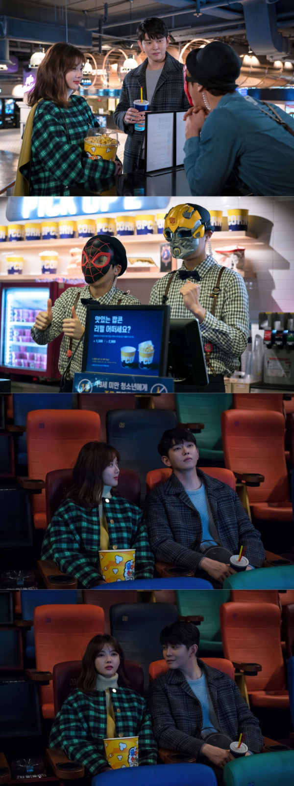 JTBC 월화드라마 '일단 뜨겁게 청소하라' 제작진은 28일 핑크빛으로 물든 장선결(윤균상 분)과 길오솔(김유정 분)의 영화관 데이트 현장을 공개했다.
