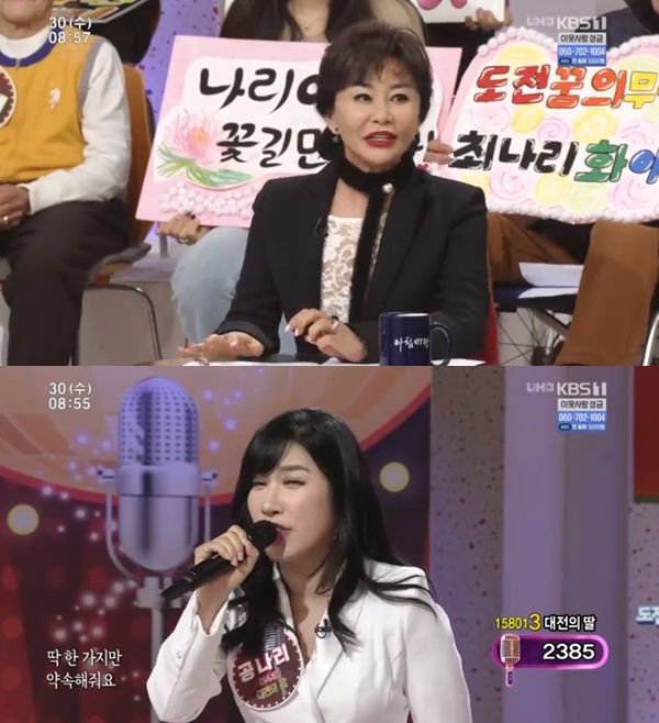 30일 방송된 KBS1 '아침마당'의 '도전 꿈의 무대'에는 가수 공나리, 황일우, 현이, 이찬성, 최나리 등이 출연하고 진미령, 김혜영, 황기순이 패널로 참여했다.