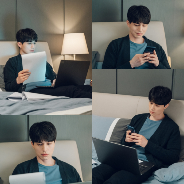 사진 속 권정록은 편안한 차림으로 침대에 기대어 있다. 그는 워커홀릭답게 한 쪽 손에는 서류를 들고 무릎 위에는 노트북을 올려놓았다. 그는 모니터 화면을 응시하며 바쁘게 업무를 처리하고 있다.