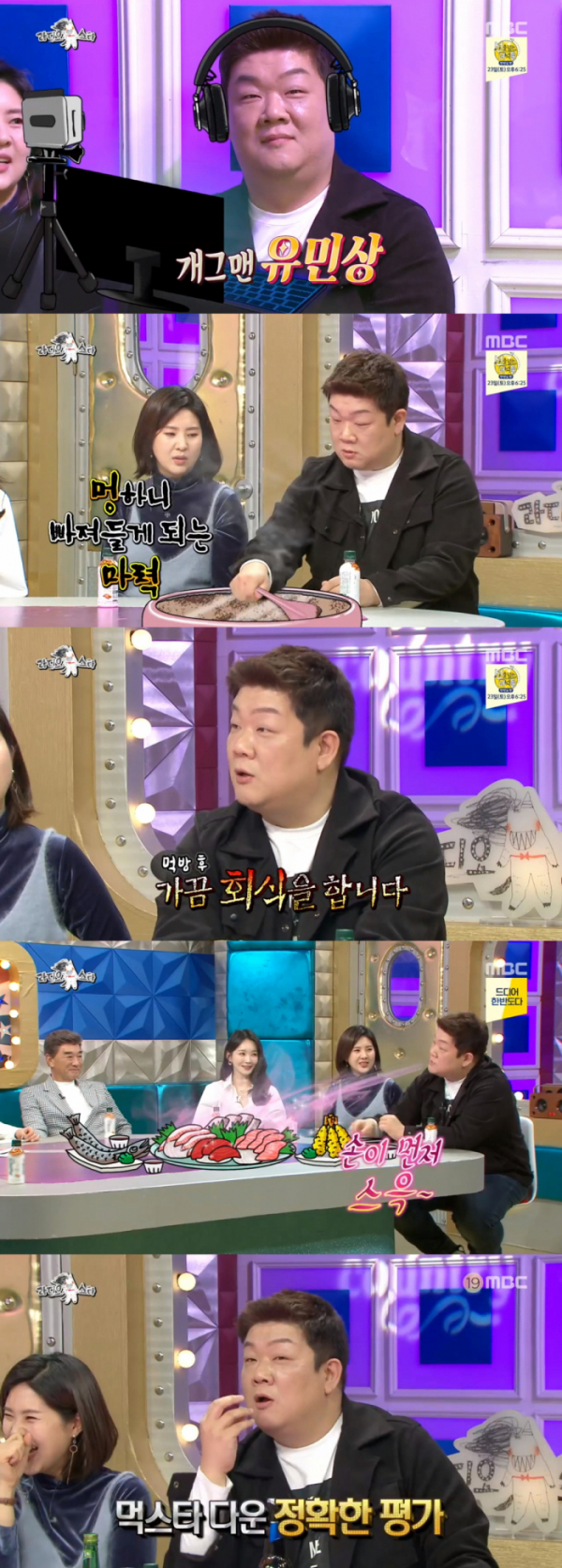특히 유민상은 특유의 재치로 먹방 팁과 먹방 상식을 전달해 스튜디오를 웃음바다로 만들었다. '맛있는 녀석들' 촬영 후 회식을 할 때 배가 불러도 새로운 음식이 눈앞에 있으면 먹게 된다는 '견먹생심' 효과를 찰지게 설명하는가 하면, 강민경이 유칼립투스를 설명할 때 "코알라들이 먹는 것"이라며 깨알 상식을 전해 먹는 쪽으로는 다 안다는 찬사를 받았다. 또한 강민경이 직접 탄 꿀주를 마신 후 그는 "처음 마실 때는 단 향이 나지만 뒷맛은 온통 소주"라며 먹스타다운 날카로운 평가를 해 웃음 폭탄을 날렸다.
