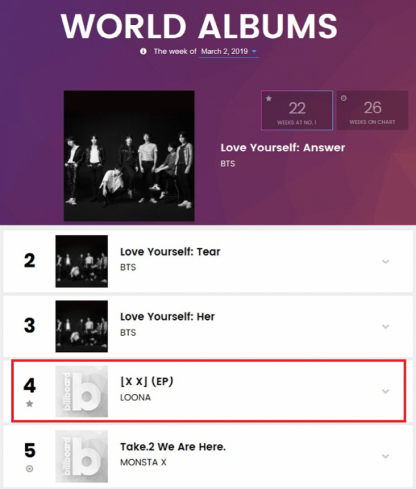 소속사 블록베리크리에이티브는 27일 "이달의 소녀의 리패키지 앨범 'X X'(멀티플 멀티플)이 26일(현지시간) 빌보드가 발표한 월드앨범 차트에서 4위를 차지했다"고 전했다.