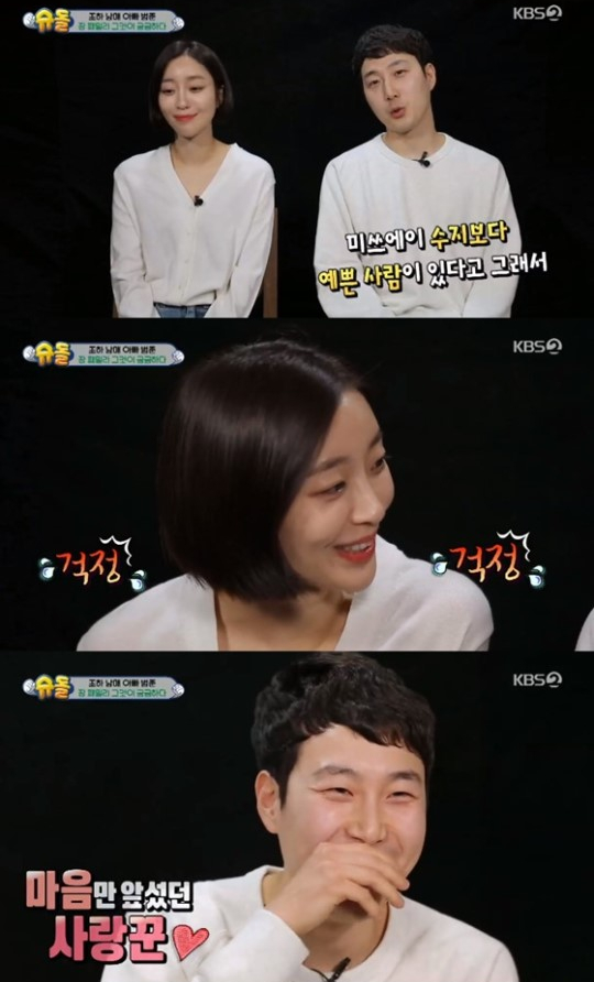 이날 송승아는 "기타를 알려주던 선생님이 알아두면 좋은 사람이 있다고 해서 만나보게 됐다"고 말했다. 장범준은 "지인이 미쓰에이 수지보다 예쁜 사람이 있다고 하더라"라며 아내의 미모를 칭찬했다.