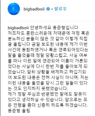 용준형은 11일 자신의 인스타그램에 "저조차도 혼란스러운데 저 때문에 걱정 혹은 분노하신 분들이 많은 것 같아 이렇게 직접 글 올린다"며 "금일 보도된 내용에 제가 이번 사건에 동참했거나 혹은 연루돼있다는 말을 들었을 때 정말 당황스럽고, 사실 여부를 떠나 이런 일에 연관돼 이름이 거론됐다는 사실에 다시 한번 저를 돌아보게 됐다"고 말했다.