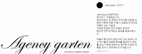 허현의 에이전시 가르텐은 12일 공식 인스타그램을 통해 "현재 논란인 모 연예인 카카오톡 대화방과 관련, 가르텐 모델 허현이 포함돼 있다는 의혹이 있는 가운데 가르텐 허현은 전혀 친분도 없으며 본인과 전혀 관계없는 일임을 말씀드립니다"고 공식 입장을 밝혔다.