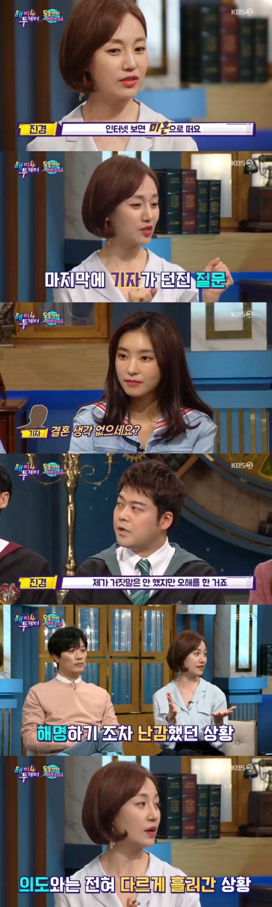 진경은 21일 방송된 KBS2 '해피투게더 시즌4'(이하 '해피투게더4')에서 "사실 한 번 갔다 왔다. 그런데 인터넷에 보면 미혼으로 뜨더라"라고 말했다.