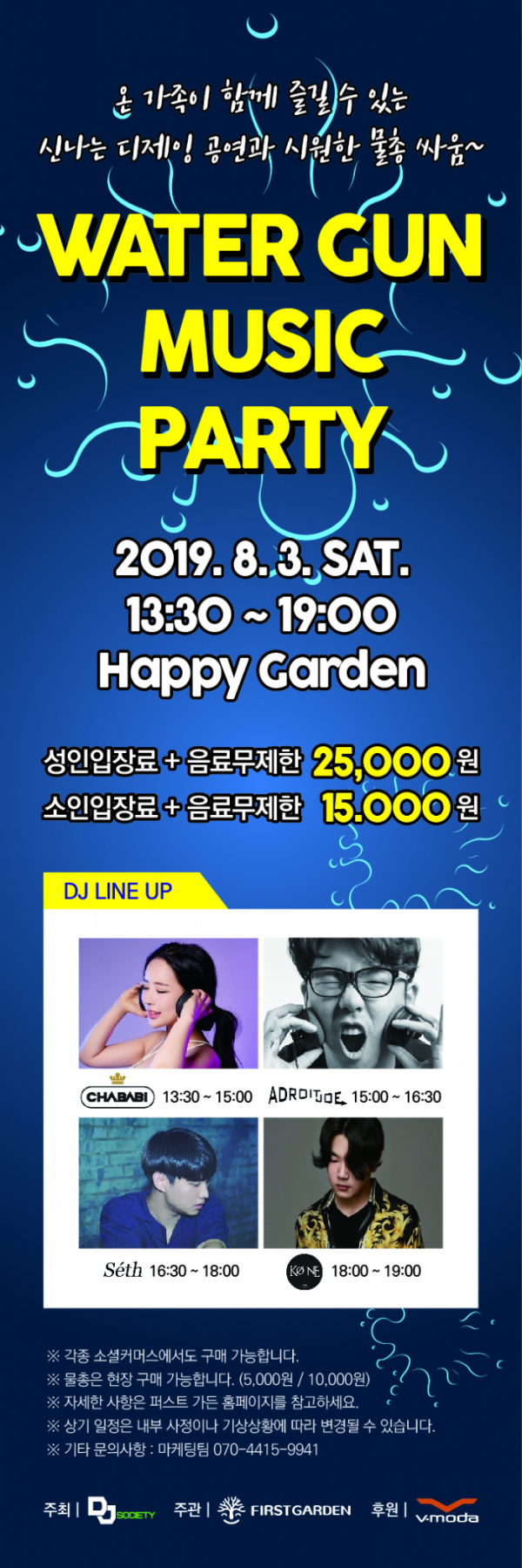 디제이소사이어티는 오는 8월 3일 경기도 파주시 퍼스트가든내 해피가든에서 환상적인 공연과 퍼포먼스를 즐길 수 있는 '워터건 페스티벌'을 진행한다.