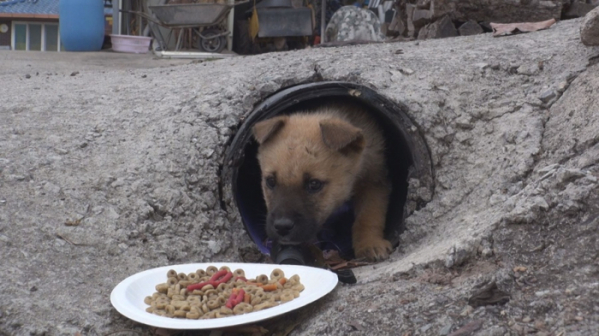 여기에 두 달 전 축사에 찾아와 눌러앉았다는 개 땅땅이 역시 하루 종일 소들 곁에 머물고 있다. 주인아저씨가 밥을 챙겨주고 있지만, 땅땅이는 아저씨의 손길을 피하기 바쁜데가 꾸꾸는 무슨 험한 일을 겪었는지 한 쪽 눈이 불편해 보인다.