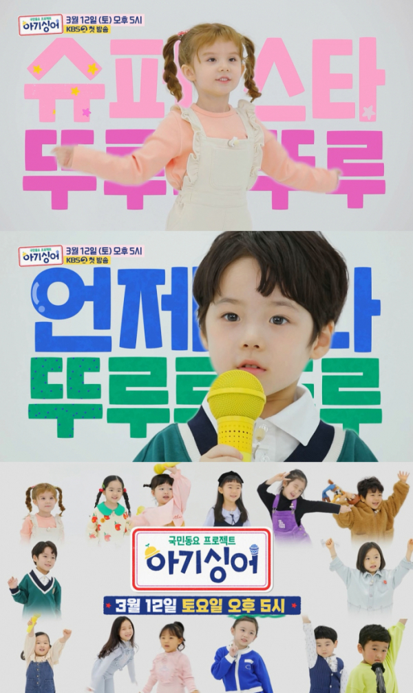 KBS 2TV 새 예능프로그램 ‘국민동요 프로젝트 - 아기싱어’(이하 ‘아기싱어’) 측은 지난 23일 오후 6시 KBS 공식 유튜브 채널을 통해 ‘아기싱어’ 메인 테마송 영상을 공개했다.