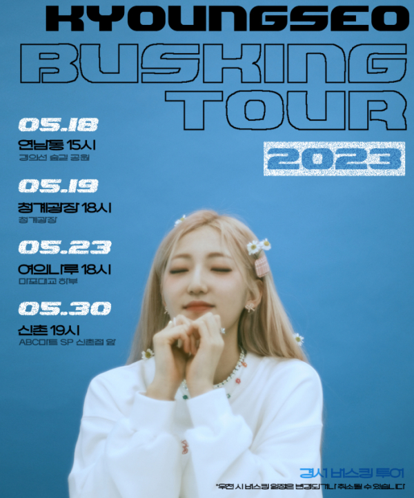 13일 낮 12시 경서의 공식 SNS를 통해 ‘2023 경서 버스킹 투어’의 일정이 담긴 포스터 이미지가 공개됐다. 이에 따르면, 경서는 오는 18일 오후 3시 서울 연남동 경의선 숲길 공원을 시작으로 19일 오후 6시 청계광장, 23일 오후 6시 여의나루 마포대교 하부, 30일 오후 7시 신촌 ABC마트 SP 신촌점 앞에서 버스킹을 진행한다. 포스터 속 일정 외에도 경서는 오는 6월까지 다양한 지역에서 버스킹을 이어갈 예정이다.