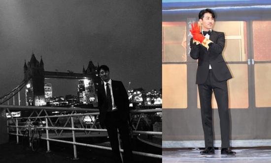 演员车胜元公开了在伦敦大桥前摆出模特姿势拍的照片。