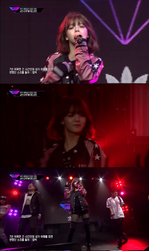지민은 5일 방송된 Mnet ‘언프리티 랩스타’에서 4번 트랙 참여자를 가리기 위한 대결에서 당당히 2위에 올랐다.