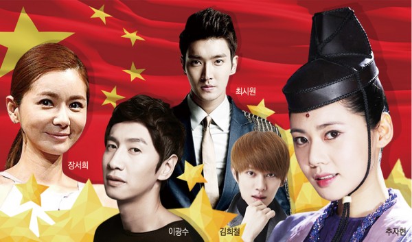 不仅如此,刘在石、李光洙,金钟国等综艺明星也在中国得到了超高的人气,李光洙等一些综艺明星以高额的出演费陆续进军中国的综艺节目。《Running man》的李光洙出演了CJ E&M与中国湖北卫视共同制作的明星恋爱真人秀节目《如果爱第二季》,最近在《无限挑战》中以Six man的候选人员与观众见过面的男团Superjunior的成员崔始源出演了江苏卫视的《我们相爱吧》,展示了综艺明星的面貌。金钟国、Kang Ta、张赫,赵世豪等出演中国CCTV的《叮咯咙咚呛》,金希澈(《一路上有你》)、张瑞希(《国色天香》)、秋瓷炫(《明星到我家》),韩彩英(《两天一夜》)等许多明星出演了中国综艺节目,吸引了中国观众的视线。