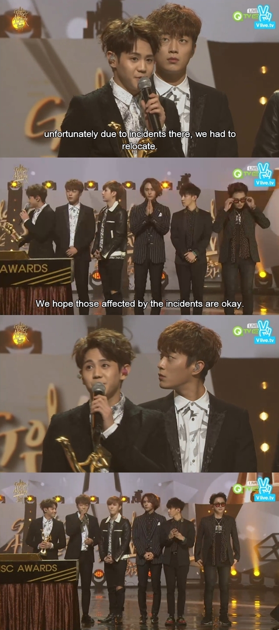 BEAST成员梁耀燮在获奖感言中提到了因中国深圳的滑坡事故而更改举办场地的颁奖典礼,称:“希望遭遇心痛的事情的人们能够早日治愈疼痛”。