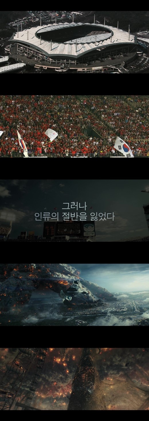 ‘인디펜던스 데이: 리써전스’ 한국 특별판 영상은 대한민국 국민이 응원하고 있는 상암경기장에서 시작된다. 장엄한 화면 위로 흐르는 익숙한 ‘애국가’가 나오면서 외계인의 공격이 시작된다.
