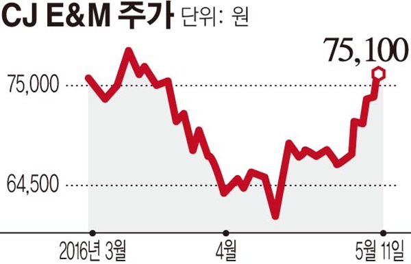 한편 CJ E&M은 2016년 연결기준 1분기 매출액이 3135억원으로 전년 동기 대비 7.0% 늘었으나 영업이익은 89억원으로 전년대비 2.9% 감소했다고 발표했다. 당기순이익은 125억원으로 86.2% 감소했다.