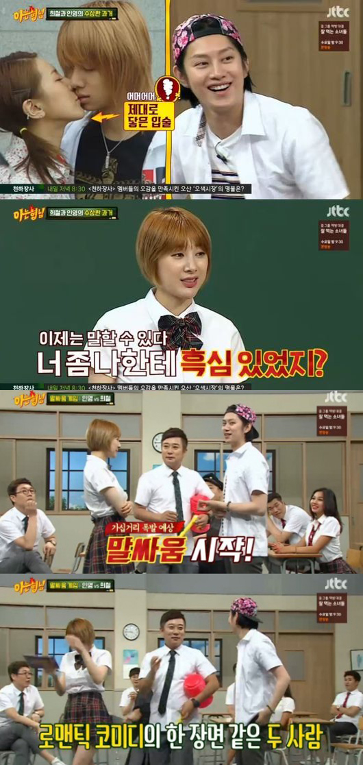 이어진 '말싸움 게임'에서 서인영과 김희철의 폭로전은 계속됐다. 서인영은 김희철을 향해 “나랑 키스신 이상으로 상상해본 적 있지?”라고 물어 또 한 번 김희철을 코너에 몰았다.