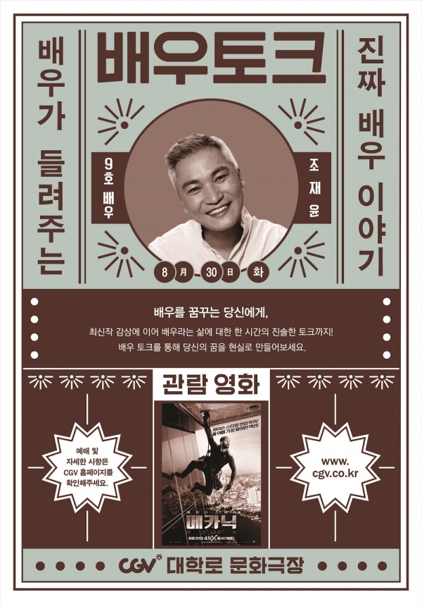CGV대학로 문화극장은 오는 30일 오후 5시, 영화 ‘메카닉': 리크루트’ 상영 후 배우 조재윤과 함께 그만의 연기 경험과 철학에 대한 이야기를 나누는 배우토크시간을 갖는다고 26일 밝혔다.