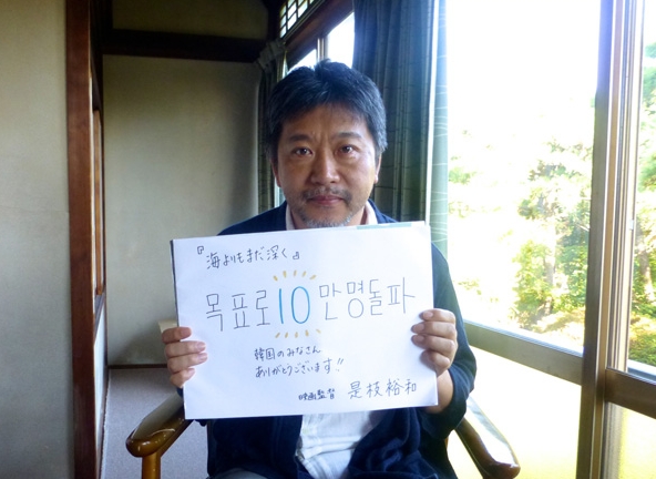 공개된 사진 속에는 고레에다 히로카즈 감독이 ‘목표로 10만 명 돌파’라는 다소 서툴지만 정성껏 쓴 한글 메시지와 함께 미소를 짓고 있다.