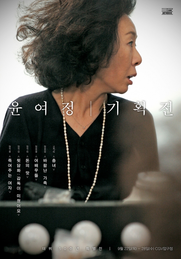 ‘윤여정 특별전’에서는 ‘충녀’부터 ‘바람난 가족’, ‘돈의 맛’, ‘여배우들’, ‘뒷담화: 감독이 미쳤어요’, 그리고 미개봉작 ‘죽여주는 여자’까지 그녀의 대표작 6편을 선보인다. CGV아트하우스 압구정에서 22일부터 28일까지 만날 수 있다.
