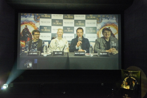 ‘캡틴 아메리카: 시빌 워’로 MCU 페이즈3의 시작을 알린 마블이 ‘닥터 스트레인지’에 거는 기대는 상당하다. 마블 스튜디오의 수장 케빈 파이기는 이 작품을 “마블 시네마틱 유니버스의 완전히 새로운 측면을 열어줄 작품”이라 설명했는데, 그 자신감을 확인할 수 있는 자리가 14일 오전 CGV 왕십리에서 ‘닥터 스트레인지 라이브 컨퍼런스라’는 이름으로 열렸다. 스콧 데릭슨 감독과 배우 베네딕트 컴버배치, 틸다 스윈튼, 마블 스튜디오 대표 겸 제작자 케빈 파이기가 영상을 통해 한국 기자단을 만나다.