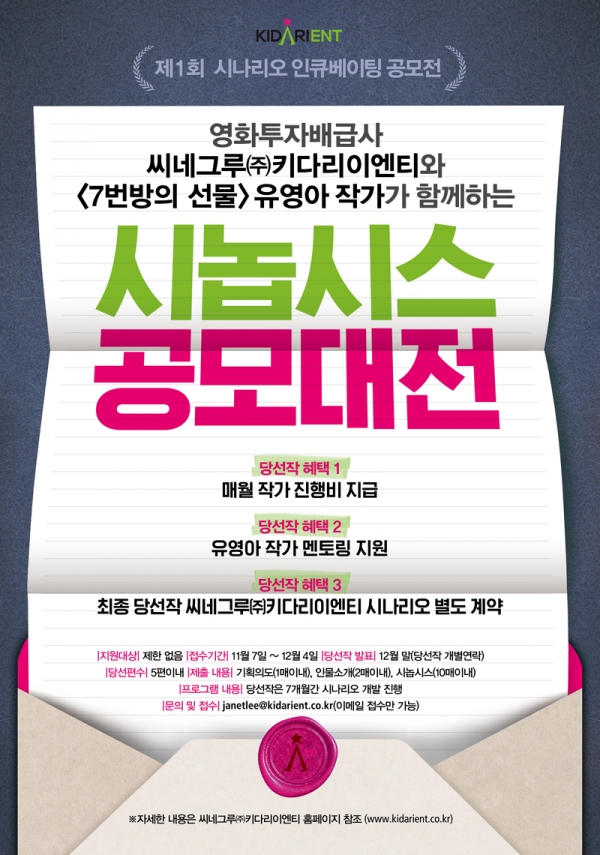 씨네그루 키다리이엔티와 유영아 작가의 글뫼가 공동주최하는 시나리오 인큐베이팅 공모전이 실시된다.