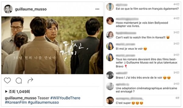지난번 해외 포스터를 자신의 트위터와 인스타그램에 올려 영화에 대한 끝없는 애정을 보이며 전세계 팬들의 열띤 반응을 모았던 기욤 뮈소가 이번엔 모션 포스터를 인스타그램에 업로드 해 '당신, 거기 있어줄래요'를 지원 사격했다.