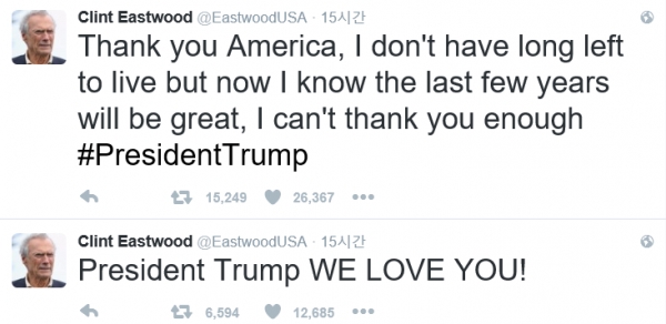 영화감독 클린트 이스트우드는 8일(현지시간) 자신의 트위터를 통해 “대통령 트럼프, 우리는 당신을 사랑한다”(President Trump WE LOVE YOU!)며 기뻐했다.