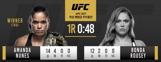 31일 로우지는 UFC 207 메인이벤트에서 챔피언 아만다 누네스에게 1라운드 48초만에 TKO패배를 당했지만 승리에 관계 없이 300만 달러(36억 원)를 받게 됐다.
