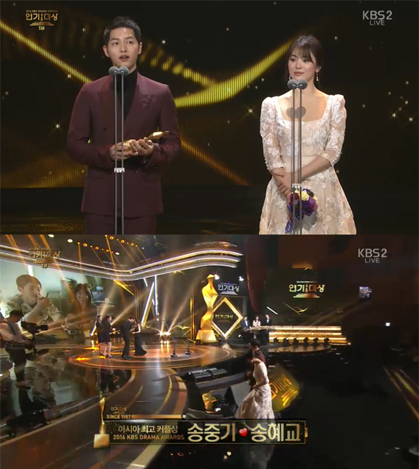 송중기는 “이 상은 예상 못했다. 강모연(송혜교) 유시진(송중기)이라는 멋진 커플을 그려주신 작가님들에게 진심으로 영광을 돌리겠다”고 소감을 전했다.