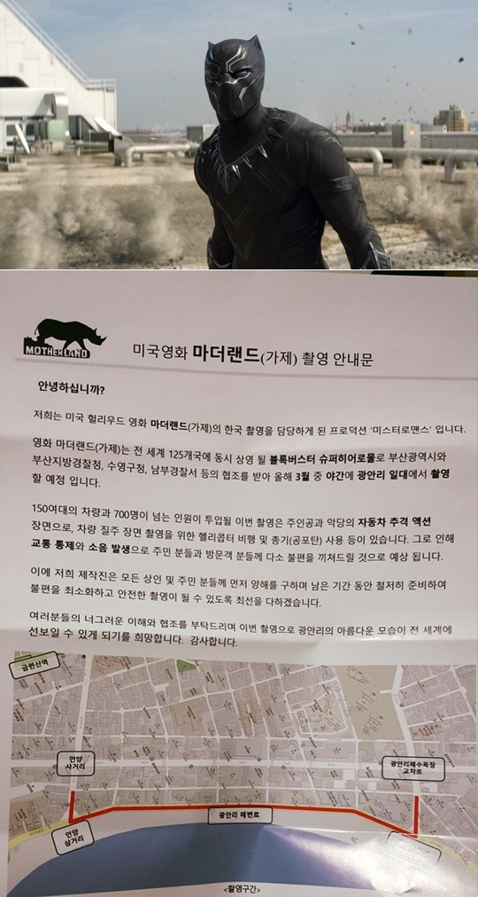 ‘마더랜드’는 영화 ‘블랙팬서’의 프로젝트 이름으로 안내문에서 영화 관계자 측은 부산광역시와 경찰청 등의 협조 아래 올해 3월 중 야간에 광안리 일대에서 영화를 촬영할 예정이라고 밝혔다.